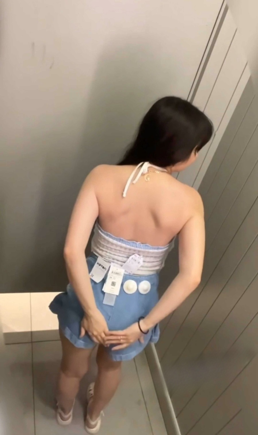 嫩滑少妇 在商场试衣间裸着全身开始时装表演 俩个白奶和无毛白虎很是显目